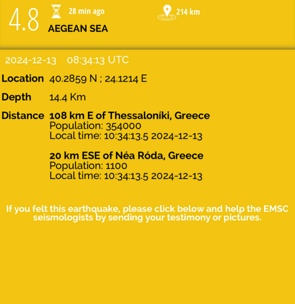 Силен трус е станал преди минути в Егейско море. Земетресението със мощ от 4,8 по скалата на Рихтер е регистрирано на 108 километра източно от Солун. То е било на 14 километра дълбочина.