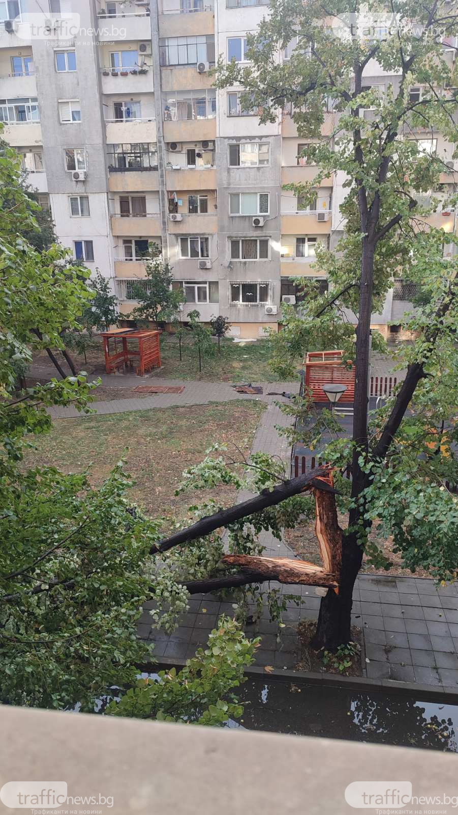 След бурята в Бургас пък на доста места в града има прекършени дървена. Има сигнали и за паднали покриви, счупени чадъри по заведения и плажове. На места гръмнали и фотоволтаиците по постройките.