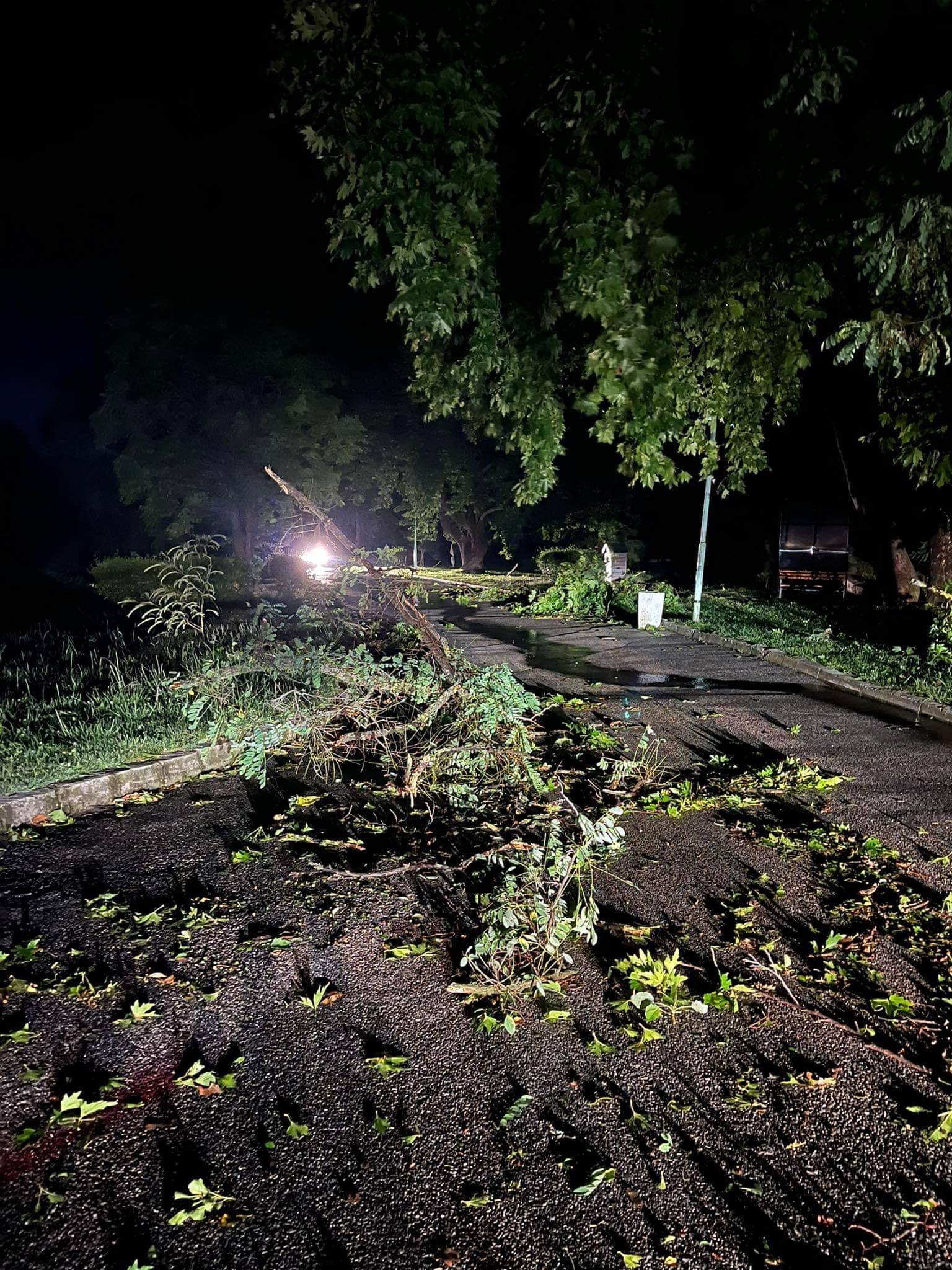 Екипи на Община Сандански, Районното ръководство на полицията и противопожарната работа работят по премахване на падналите дървета и вредите от бурята.