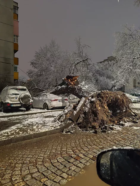 Наш четец алармира за случай на ул. „ Апостол Узунов “ в кв. „ Съдийски “, където през нощта дърво, натежало от снега, е паднало върху паркирана кола. По думите му, улицата е осеяна със остарели и изсъхнали дървета, които от години не са поддържани.