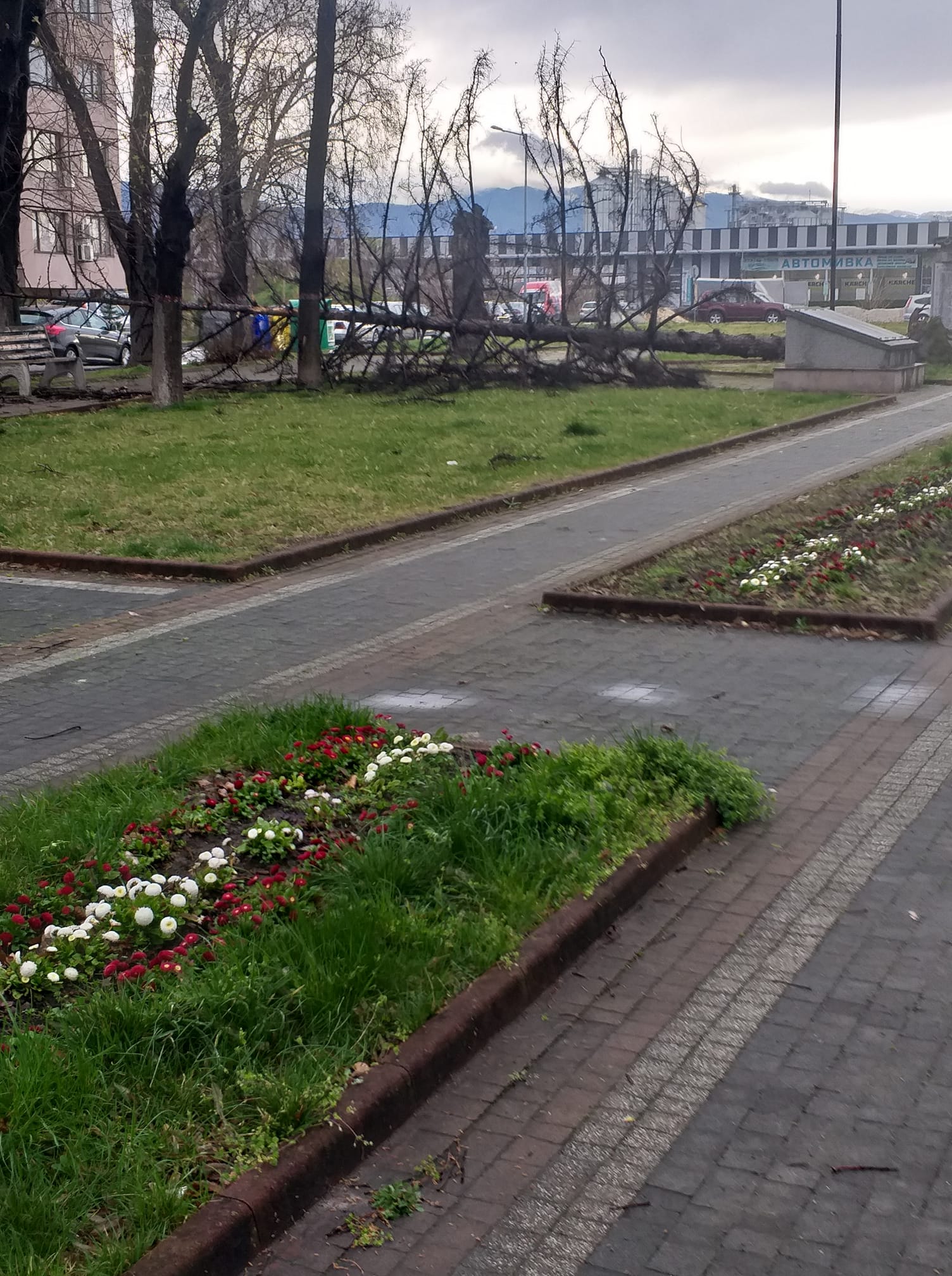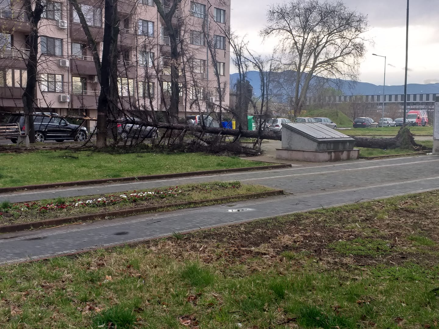 В пазарджишки квартал бурните ветрове са отнесли гараж. Металната структура в ж.к. „ Марица “ е преобърната на назад. Съборено е и голямо дърво.