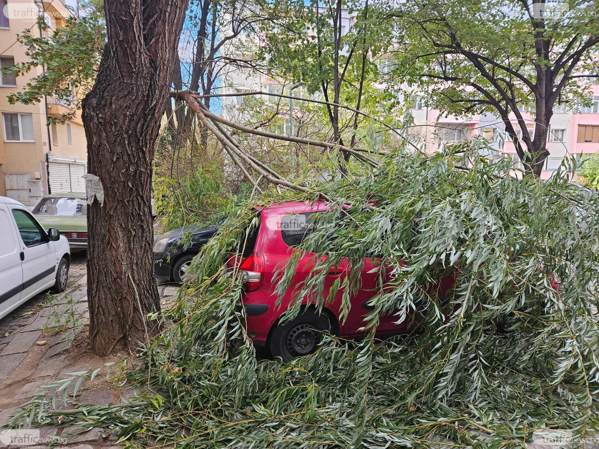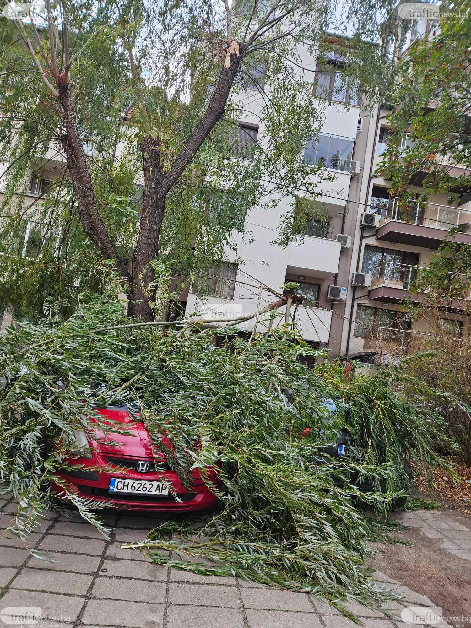 По информацията на читателя таванът на аления автомобил е огънат, а на другата кола наподобява, че няма съществени вреди. Тя обаче е съвсем незабележима и повредите по нея ще могат по-точно да се открият откакто се отстранят клоните.