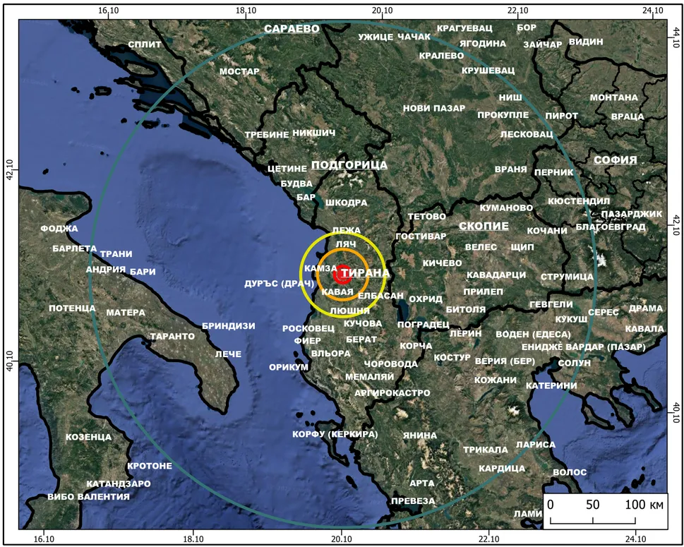 Трусът от 4,5 по Рихтер е с епицентър наоколо до столицата Тирана. Бил е с дълбочина 11,9 километра. Той е усетен на огромен периметър – в това число в елементи от Северна Македония, Косово, Черна гора, Западна България и даже Южна Италия.