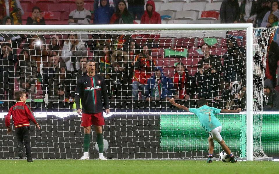 Кристиано Роналдо младши сподели какво може с топката след контролата на Португалия с Алжир. “Мореплавателите” победиха с 3:0 в последната си инспекция преди старта на Мондиал 2018, а след последния съдийски сигнал Кристиано привика 7-годишния си наследник на терена.