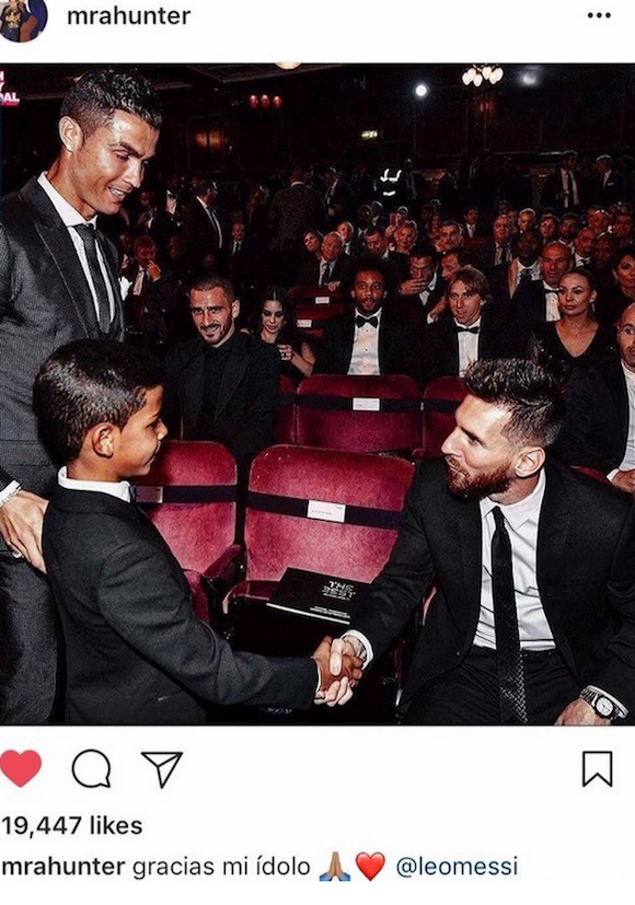 Синът на нападателя на Реал Мадрид и португалския народен тим Кристиано Роналдо - Кристиано-младши, постна през вчерашния ден в профила си в “Инстаграм” своя фотография с Лео Меси и написа, че водачът на Барса е неговият кумир и той му се възхищава. Часове по-късно обаче тази обява освен беше изтрита, само че от обществената мрежа беше отстранен и целият профил на 7-годишното хлапе.