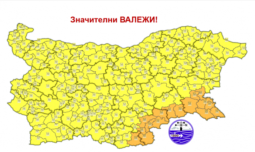 Синоптиците от Национален институт по метеорология и хидрология издадоха предизвестие от втора степен - оранжев код за обилни превалявания в 4 области – Кърджали, Хасково, Ямбол и Бургас за 27 октомври, понеделник. В останалата част от страната предизвестието е от първа степен - жълт код.