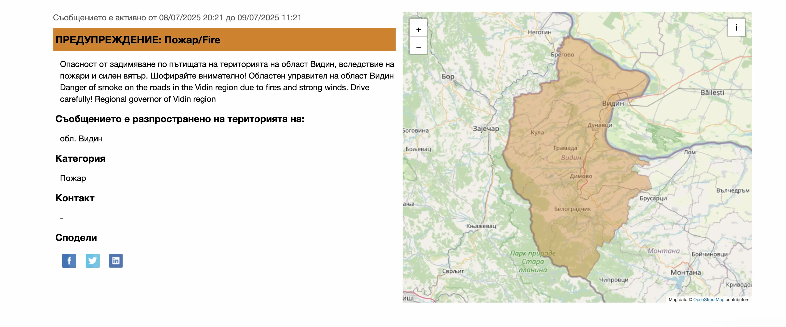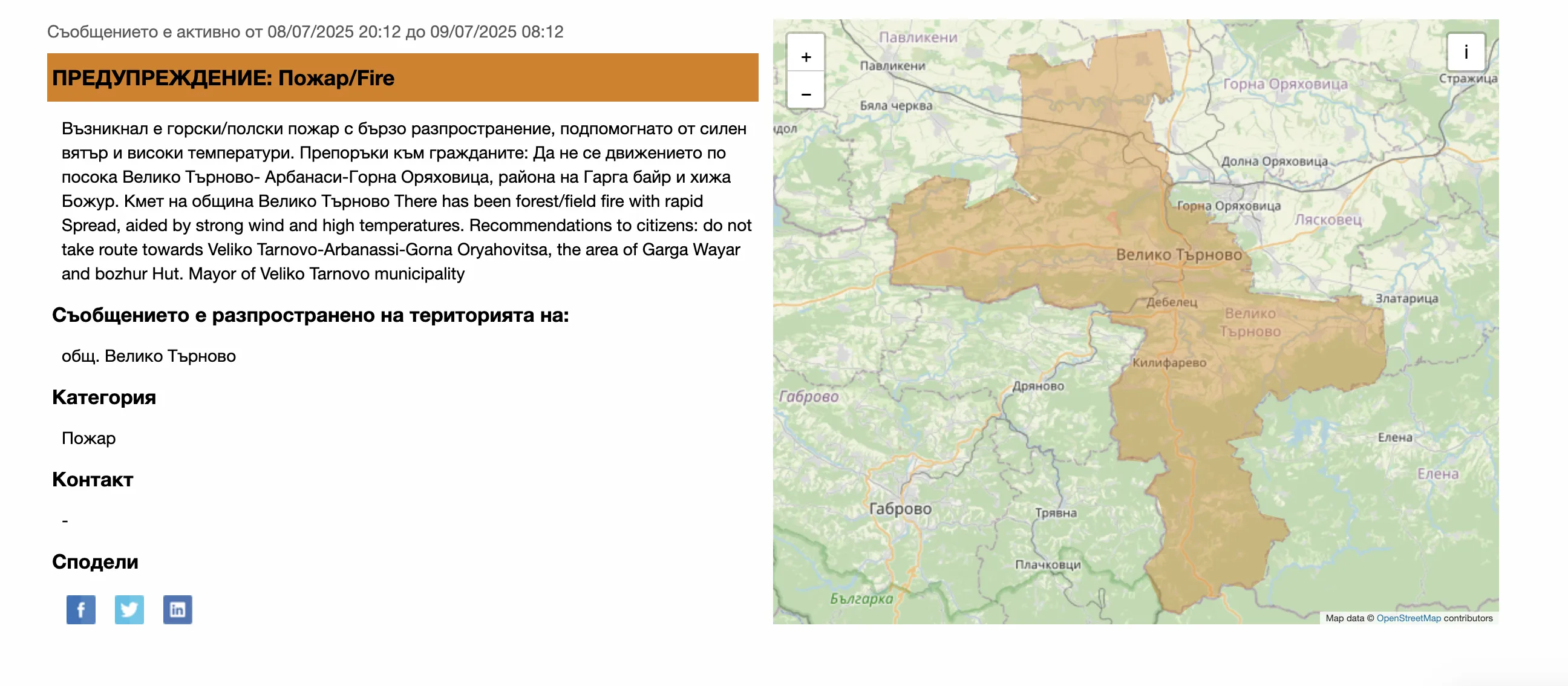 Системата за ранно предизвестие BG-Alert се е задействала поради пожара в Арбанаси и за няколко пожара във Видинско. За това се оповестява в уеб страницата на системата.