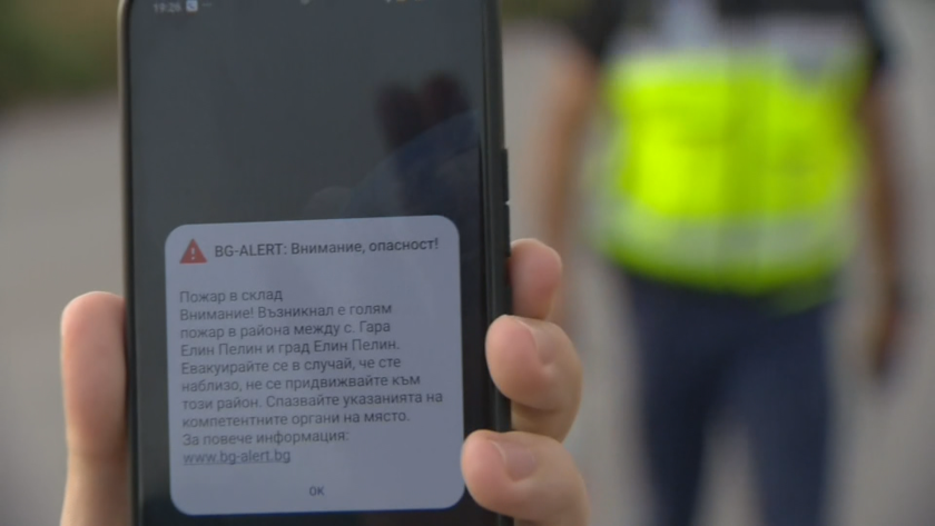 Системата за ранно предизвестие BG-Alert сработи близо час след случая с горящите хранилища край Елин Пелин. В известието се показва, че се постанова евакуация поради гърмежа.