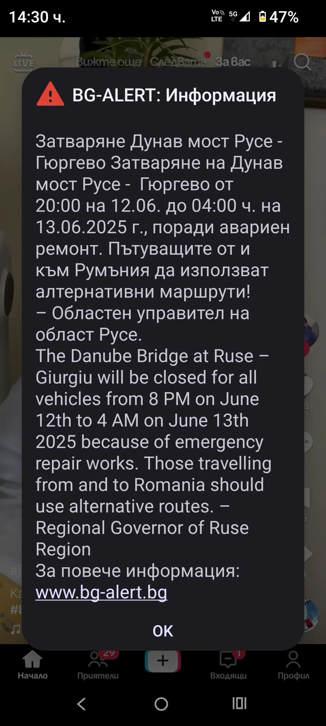 Системата за разпространяване на известия за предизвестие на популацията BG-ALERT се задейства в Русе и региона. Причината е затварянето на Дунав мост за 8 часа.
