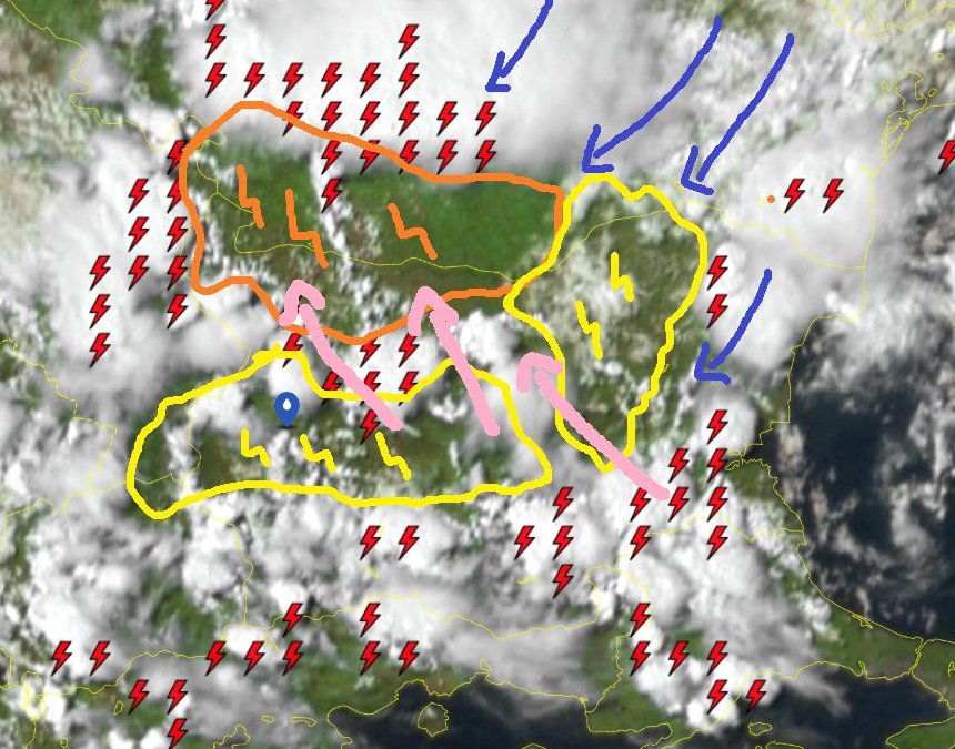 Ситуацията става извънредно комплицирана. От север-североизток продължава да прониква по-студена въздушна маса (в синьо), до момента в който от юг-югоизток се придвижва топла и влажна въздушна маса (в розово), оповестява Метео Балканс.