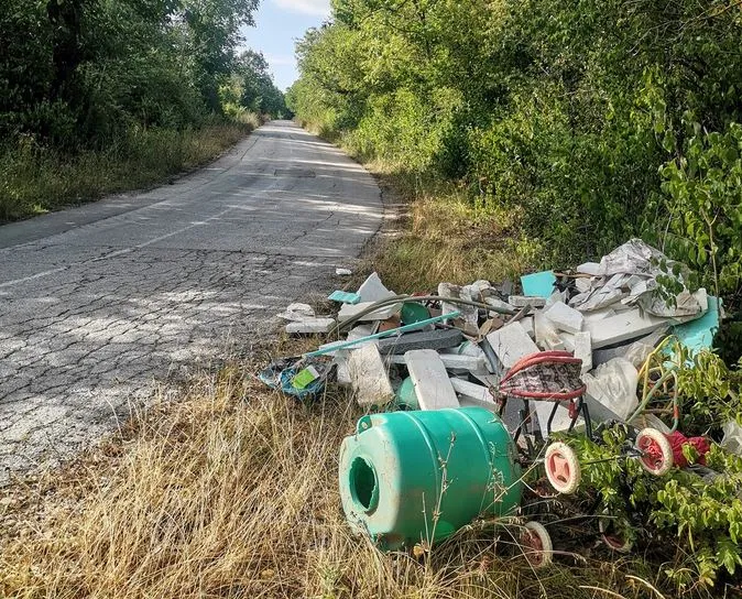 Сив поочукан път, красива природа и голяма купчина със боклук.