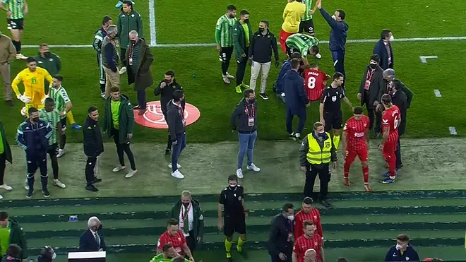 Скандал беляза дербито сред Бетис и Севиля от 1/8-финала за Купата на Краля. Мачът бе преустановен малко преди края на първото полувреме, откакто човек от публиката хвърли кол и уцели в главата бранителя на андалусийци Жоан Жордан. Иначе срещата бе същинска наслада за окото и е тъпо, че трябваше да приключи по сходен метод. При спирането резултатът бе 1:1