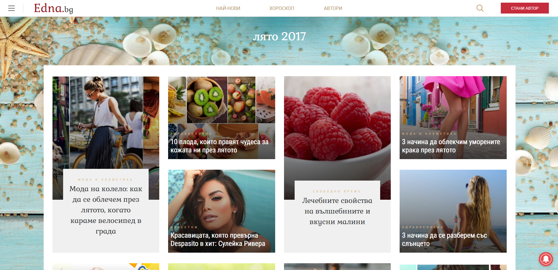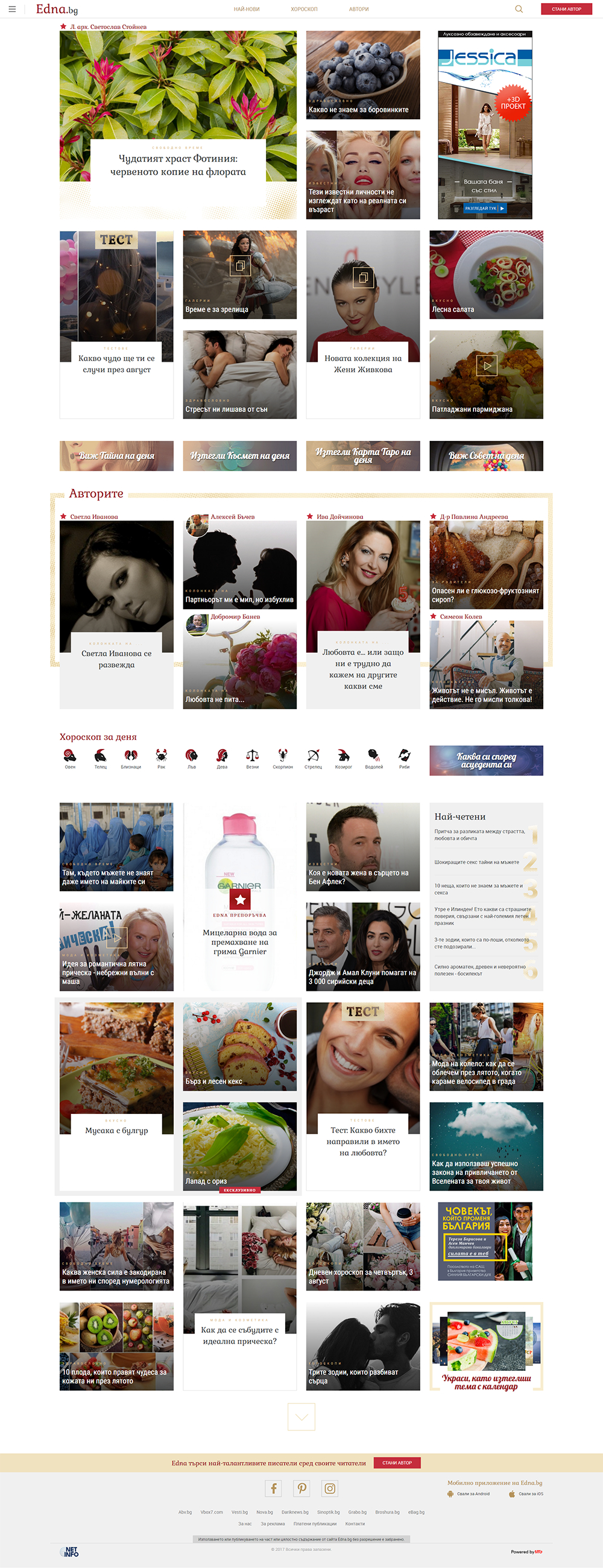 Припомняме, че за последните 5 години Edna.bg съумя да се потвърди и наложи като желания дамски уебсайт от дамите, които желаят всекидневно да научават достоверните новини от света на звездите, да четат хороскопа си, персонално направен от нашите професионални астролози и да черпят потребно и практично ентусиазъм за дома, семейството и свободното си време. И несъмнено, да се въодушевяват от материалите на нашите външни създатели.