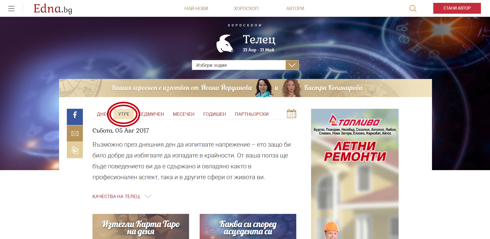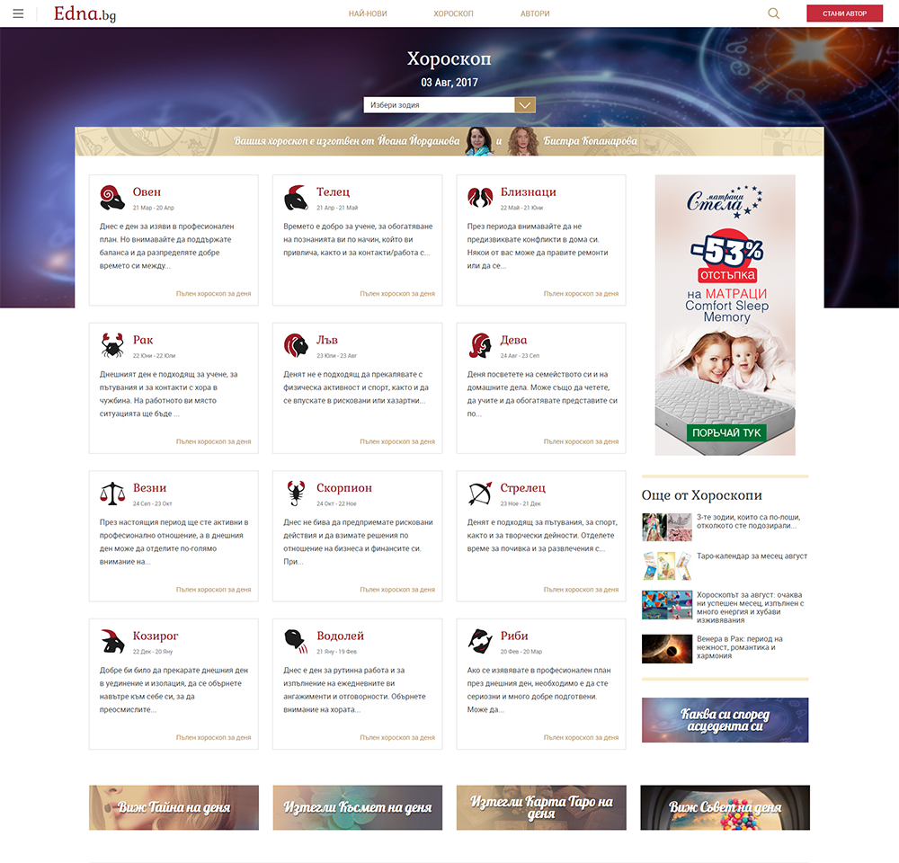 Edna.bg 5. Хороскопите ни, дело на астролозите Йоана Йорданова и Бистра Копанарова, също към този момент ще наподобяват по-различно. Вече с изключение на дневен, седмичен, месечен, годишен и партньорски хороскоп, ще можете да ревизирате и хороскопа си за утрешния ден.