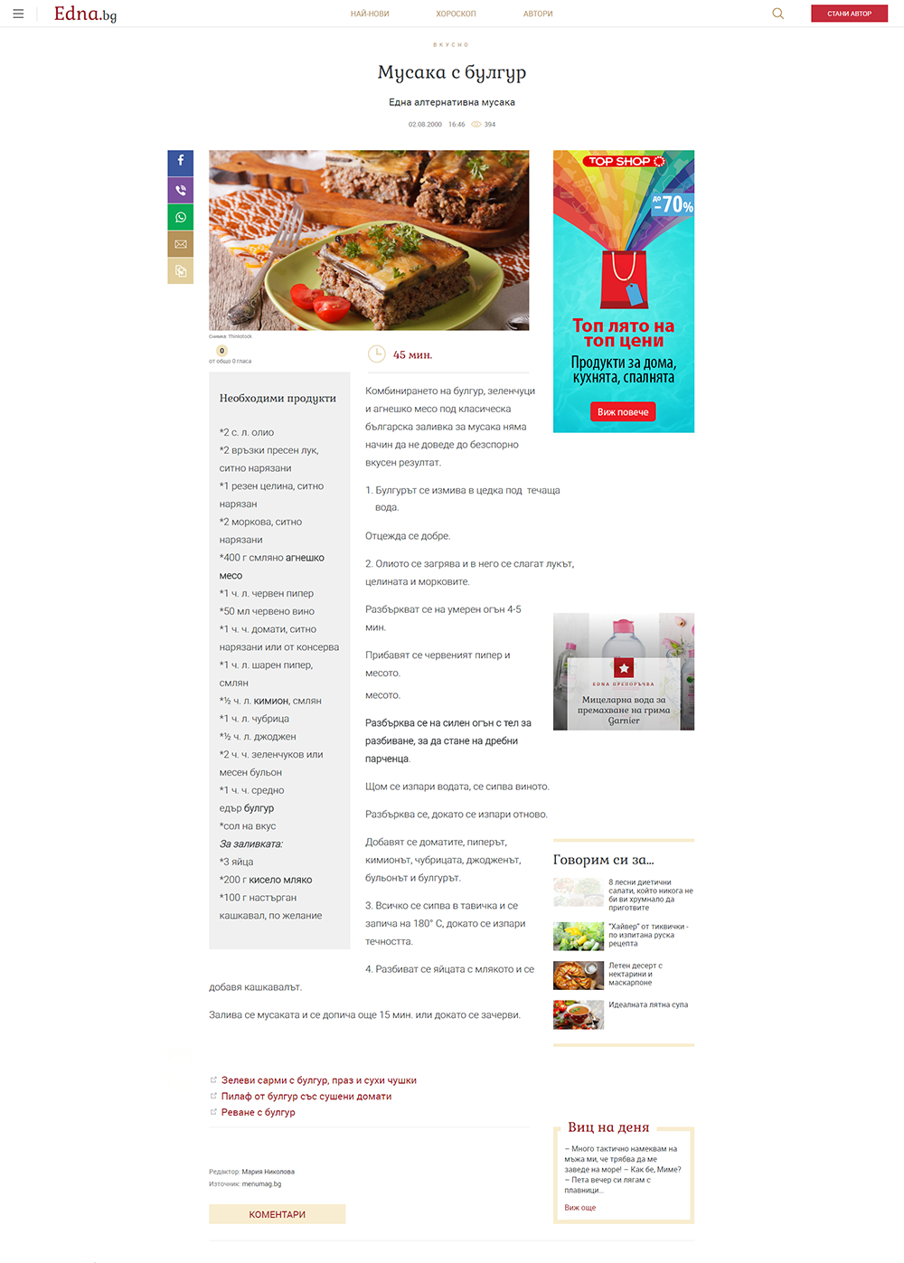 Edna.bg 5. Рецептите ни в рубриката „ Вкусно “ към този момент ще бъдат с образно разграничени нужни артикули и техника на подготвяне - за още по-голямо улеснение на читателите, а в секцията „ Бързи предписания “ постоянно можете да откриете хрумвания за дните, когато времето в кухнята ви притиска: