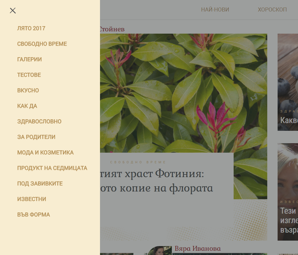 3. Топ секциите ни, Най-нови, Хороскоп и Автори, към този момент ще бъдат изведени в навигацията горе и ще можете да достигате до тях по всяко едно време, до момента в който сте в уеб страницата.