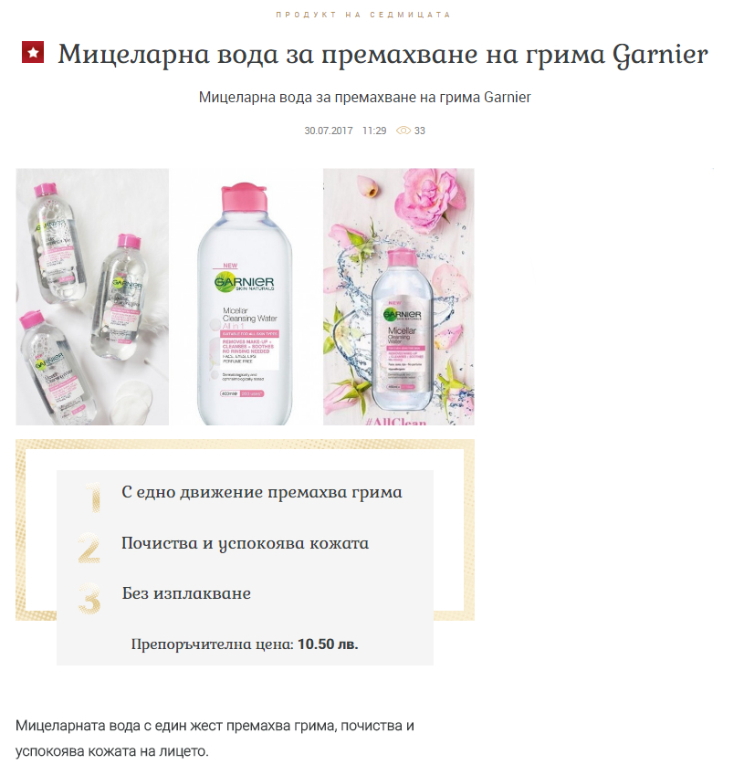 6. За всички фенове на качествените артикули, създадохме и нова категория "Продукт на седмицата ". В нея всяка седмица Edna.bg ще предлага подбрана от редакторския екип на уеб страницата козметика, фешън решения, аксесоари и уреди за хубост, хрумвания за свободното време, почивката и пътешествия.