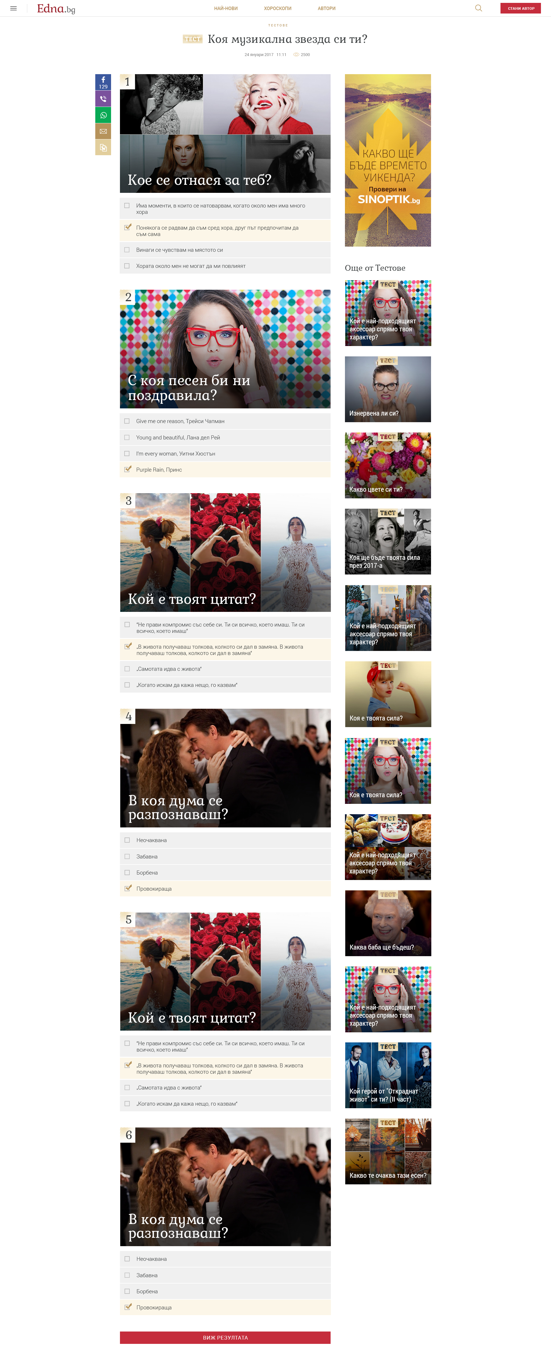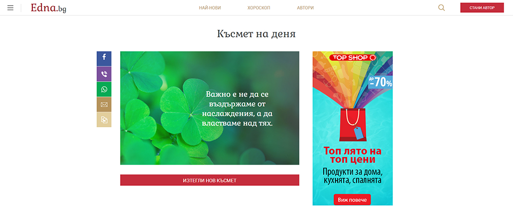 Edna.bg 3. Топ секциите ни, Най-нови, Хороскоп и Автори, към този момент ще бъдат изведени в навигацията горе и ще можете да достигате до тях по всяко едно време, до момента в който сте в уеб страницата.