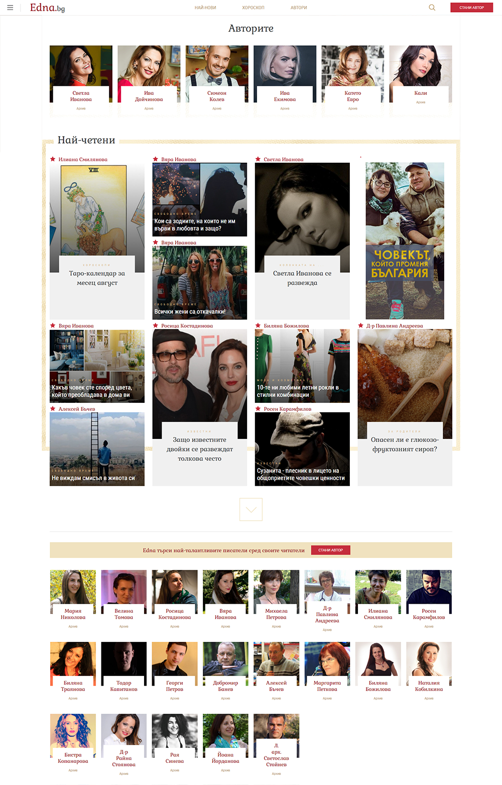 Edna.bg 4. Най-важният акценти на Edna, външните създатели - известни персони и експерти, ще си имат обособена категория. Там ще можете да откриете целият ни списък от авторско наличие.