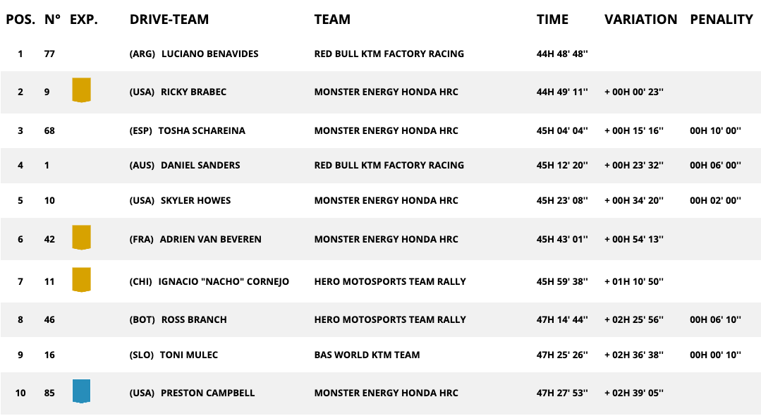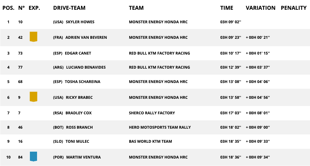 По този метод аржентинецът поведе за повторно в генералното класиране. В него преди финалните два стадия на надпреварата Бенавидес води със единствено 23 секунди пред Рики Брабек от Хонда, който даде шесто време през днешния ден. По всички проличава, че крайният победител ще бъде един от тях двамата, защото заемащият третото място Тоша Шарейна (Хонда) изостава с 15:16 минути от първото място, а до финала не остава доста.