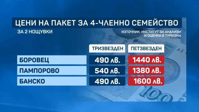За четиричленно семейство в тризвезден хотел в Боровец междинната цена на пакет за 2 нощувки, с включени закуски, е съвсем 500 лева, в Пампорово близо 540 лева, в Банско - 490 лева За същия престой в петзвезден хотел ще платим надлежно 1440 лева, 1380 лева и 1600 лева