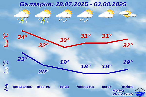 Температурите и в Югоизточна България ще се намалят по отношение на предходните дни на горещина. Максималните в страната ще са сред 29 и 34 градуса, което е доста по-ниско от рекордните стойности от последните дни.