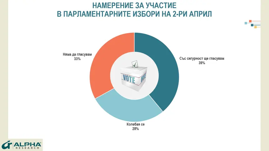 Слаба мотивация за присъединяване в изборите и паритет в борбата за първото място записва национално-представително изследване на организация Алфа Рисърч на старта на предизборната акция.