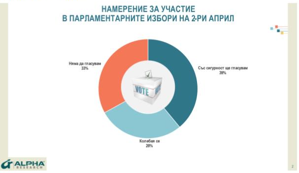 Слаба мотивация за присъединяване в изборите и паритет в борбата за първото място записва национално-представително изследване на организация " Алфа Рисърч " на старта на предизборната акция. Това сочи проучване на " Алфа Рисърч " за електоралните настройки на старта на предизборната акция.