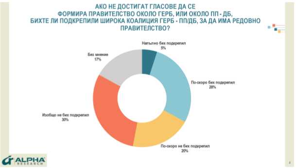 Независимо дали в 49ия Парламент ще са показани петте релативно сигурни политически сили, или ще влязат и някои от " дребните ", предизвикването пред лъчение на постоянно ръководство остава толкоз високо, колкото и пред 48 Народно събрание. При записания все още подобен избирателен резултат за ПП-ДБ и ГЕРБ-СДС, разновидностите пред всяка от двете водещи и мощно конфронтиращи се между тях обединения са или да опитат да ръководят с някоя от останалите партии (с които също имат обрисувани дълбоки разграничителни линии), или да поддържат под някаква форма общо държавно управление. Евентуална необятна коалиция сред ПП-ДБ и ГЕРБ-СДС е изрично подкрепена от едвам 5% от пълнолетните българи и още 28 на 100 я одобряват за вероятен компромис, като показват умерено утвърждение за нея. Коалиция сред първите две е нежелана от 50 на 100 от българите. По-склонни да я поддържат са последователите на ГЕРБ, до момента в който болшинството от тези на ПП-ДБ остават дистанцирани. Избирателите на Движение за права и свободи, Български напредък, Има Такъв Народ се отнасят по-скоро неутрално, а измежду най-ярките съперници на тази опция са симпатизантите на Българска социалистическа партия и Възраждане. По всичко обаче наподобява, че решението на политическата рецесия няма да пристигна от гласоподавателите, а от способността на партийните водачи да ги убедят в правилността на идващите си дейности, заключава проучването на " Алфа Рисърч ".