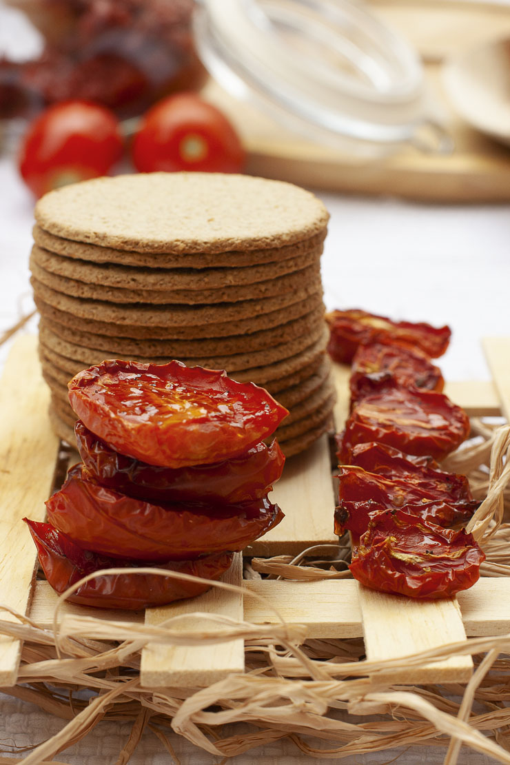 Измийте добре доматчетата и ги разполовете. Подредете ги с разрязаната страна нагоре в тавичка, авансово покрита с хартия за печене. Поръсете със зехтина, солта и черния пипер. Печете постепенно в продължение на 3 часа във фурната на 125°С. Макар че лишава известно време, резултатът са ароматни, топящи се и нежни за небцето доматчета. Може да ги сервирате върху крекери или тофу на грил, или да ги употребявате в сосове, супи и ястия, с цел да внесете опушен и компактен послевкус.