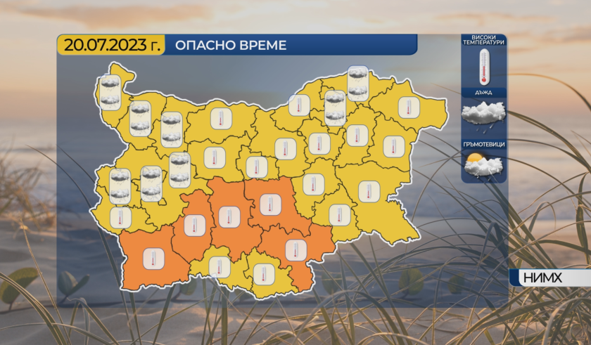 В мощ са жълт и оранжев код за рисково време, в 14 области за интензивни превалявания, а в останалата част на страната - за рисково високи температури. Максималните ще са сред 34° и 39°, София - към 34°. Вятърът ще се ориентира от запад-северозапад и краткотрайно ще се усили, което пък усилва заплахата от пожари.