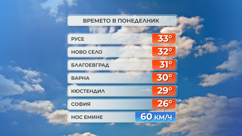Слънчево и топло беше времето през днешния ден. Най-горещо беше в Русе и Сандански – 33 градуса, в Ново Село - 32.
