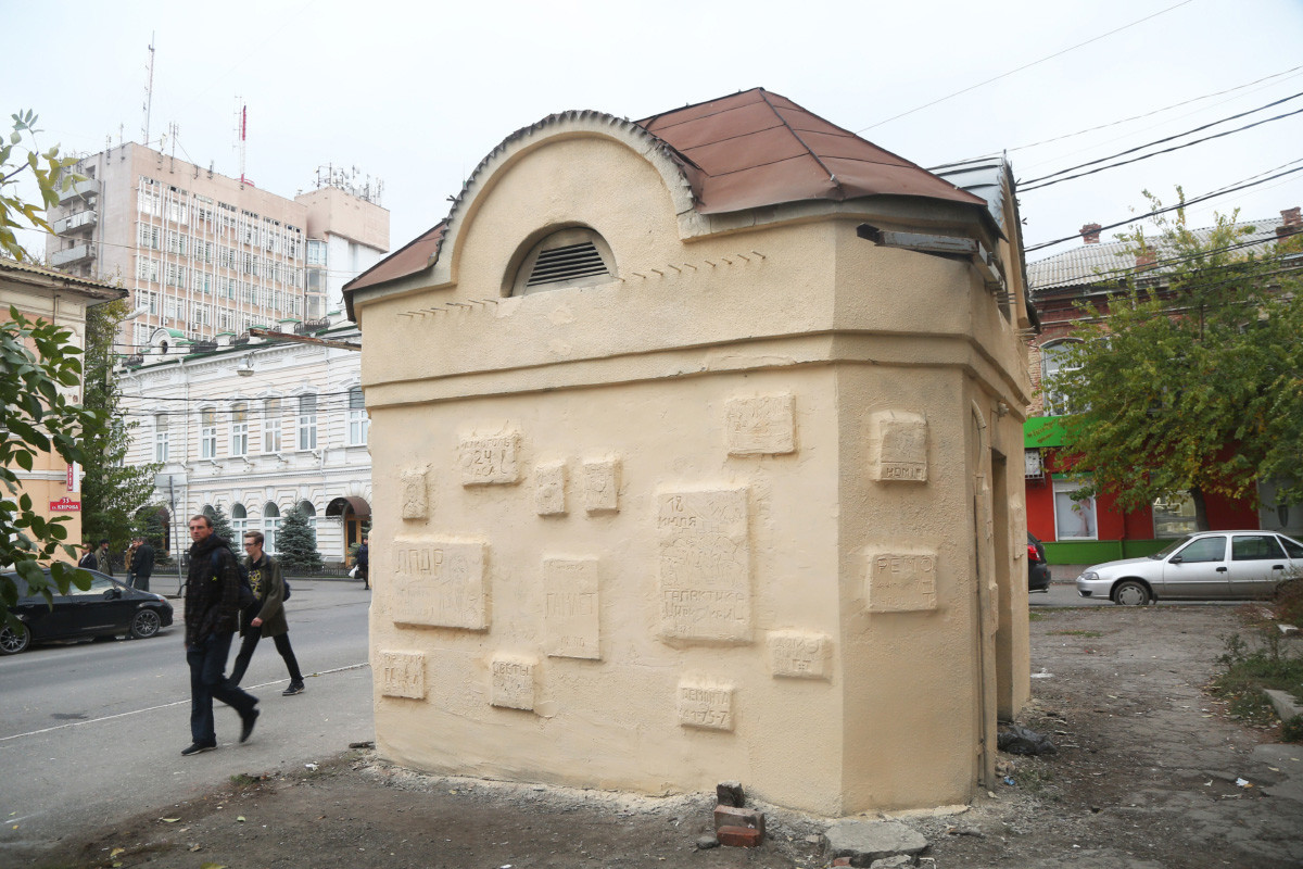 Преди време художникът се бори в Астрахан със стихийната реклама. Постоянна жертва на бележки с частни разгласи става неголяма будка в самия център на града. Слава ПТРК закрепя на нея иронични барелефи, копия на рекламни надписи – „ Продавам гараж “, „ Лекуваме алкохолизъм “, „ Окачени тавани “ и други – и ги боядисва едноцветно. Дори година по-късно на будката не се появява нито една реклама.