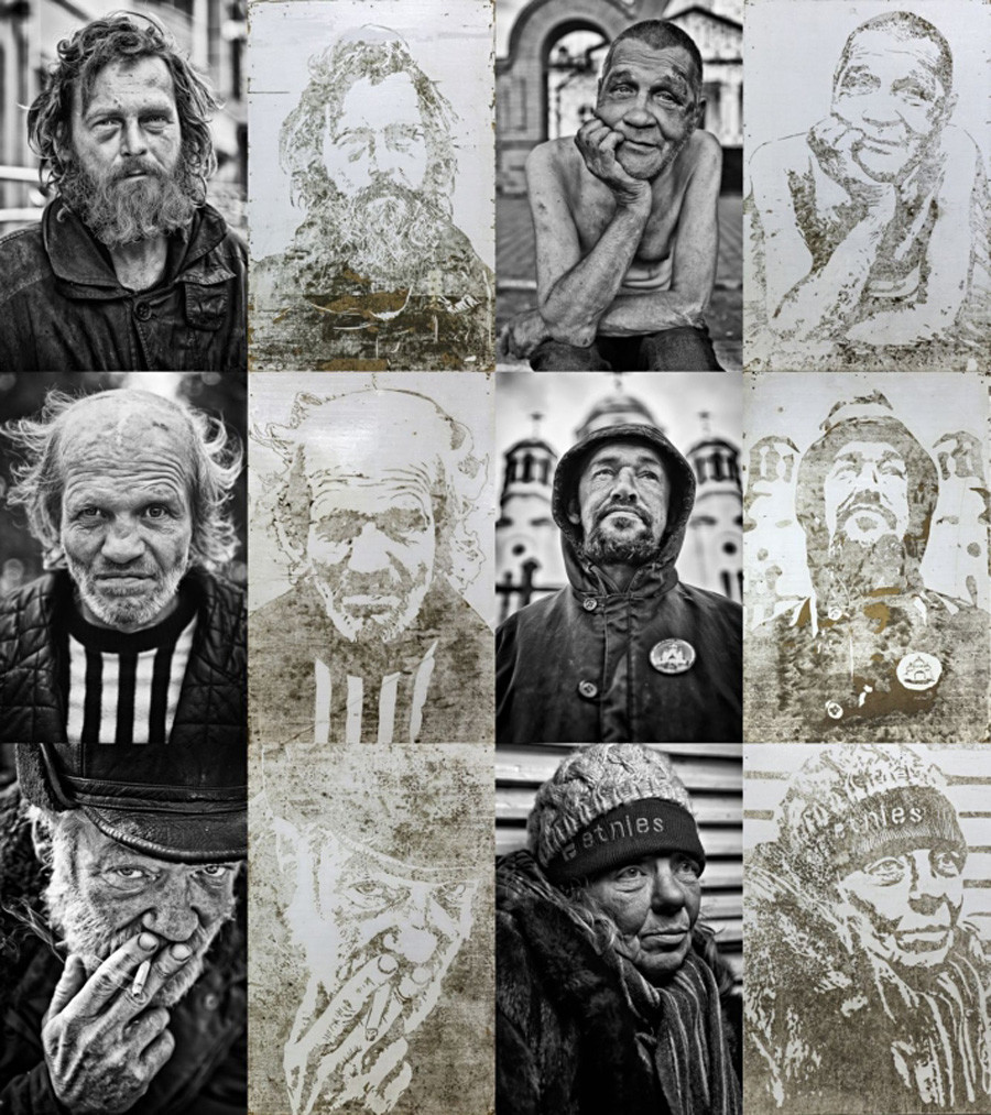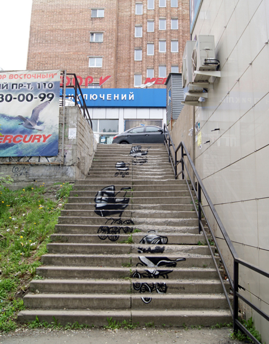 Според художника Екатеринбург е най-лоялният град към уличното изкуство. В него не му се постанова да се крие и да съгласува с някого своите графити, за разлика от Москва. Това е повода най-вече от работите му да останат в Урал, изключително тези, които повдигат остри обществени проблеми като помощта за бездомните. Той споделя, че редовите поданици на градовете възприемат бездомните като улична нечистотия, просто не ги виждат, а пък те също са хора и то с прекомерно трагична орис. Слава рисува портрети на бездомни в Екатеринбург с калта от автомобилните гуми и уличните локви. Творбите му са окачени в „ най-мръсните “ региони на града.