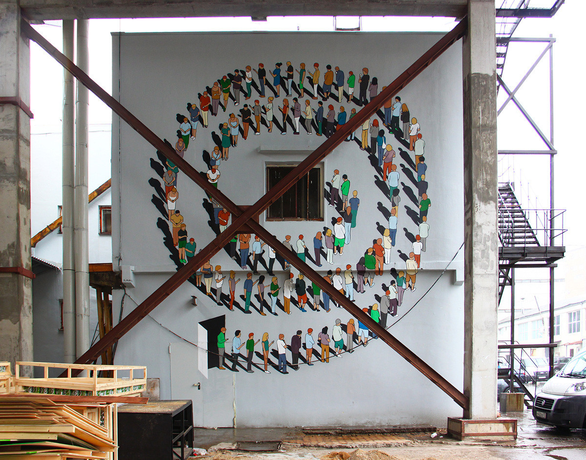 Къде отиваме всички, по какъв начин и за какво? Всичко това няма значение, основното е да не изпускаме от ръце телефона. Художникът основава тези графити в креативния клъстер „ Правда “ в Москва за музикалния фестивал TBRG GREEN JAM. Описва ги по следния метод: „ решително придвижване с телефони в ръцете по затворена серпантина от на никое място за на никое място “. Познато ли ти е?