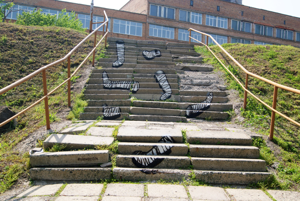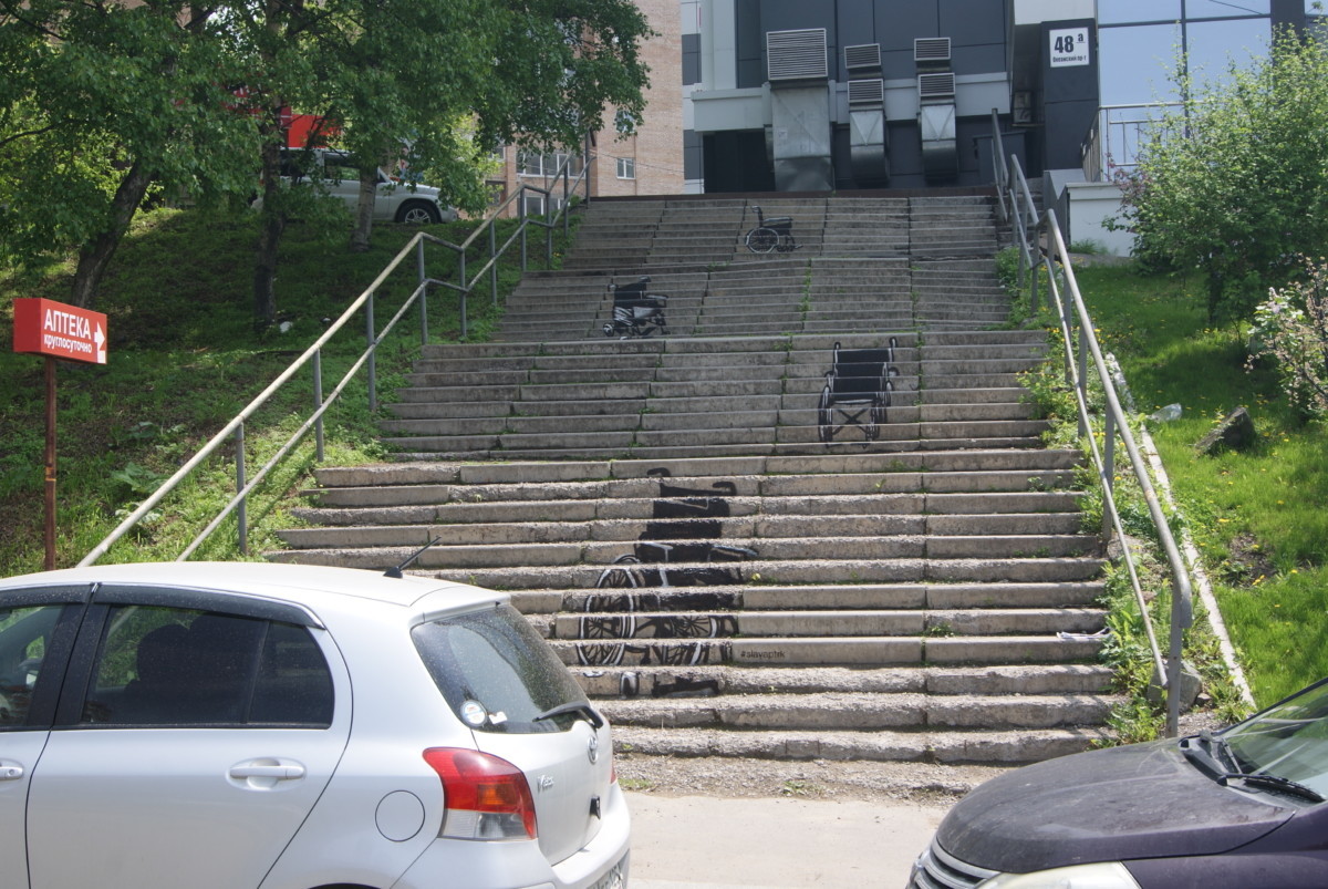 Проектът, сбъднат на доста улични стълбове във Владивосток, загатва за неналичието на интерес към обхватните планове в Русия като цяло и съответно за жестоко пренебрежителното отношение към инвалидите в колички в дин съветски град.