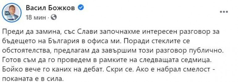 Слави Трифонов е ходил на крайници в офиса на Васил Божков, разкрия самият хазартен необут с пост във Facebook. По думите му водачът на Има Такъв Народ е бил в офиса му, малко преди да избяга от България, с цел да беседват за бъдещето на България. Божков напусна страната преди към година, а малко по-късно стана ясно, че Трифонов взема решение публично да влезе в политиката, откакто се кълнеше, че няма такива планове. „ Преди да отпътува, със Слави започнахме забавен диалог за бъдещето на България в офиса ми. Поради стеклите се условия, предлагам да приключим този диалог обществено. Готов съм да го проведем в границите на идната седмица “, написа Божков в обществената мрежа, където се изявява, тъкмо както и Трифонов.