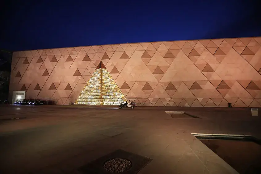 Сградата впечатлява с съвременна архитектура, която съчетава стъкло, камък и естествена светлина. Входът е завършен като пирамида, фасадата е покрита с писмени знаци и триъгълни панели от алабастър, а от горните етажи се открива панорама към пирамидите в Гиза.