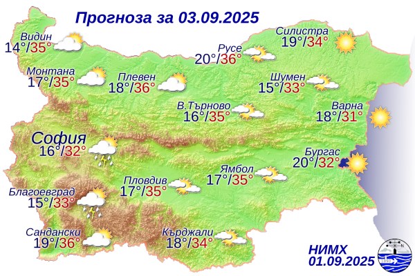 Утре, 2 септември, времето ще бъде слънчево с оптимални температури сред 30° и 35°, в София - към 30°. Ще бъде и по-малко прохладно, със слаб до сдържан вятър от изток-североизток.
