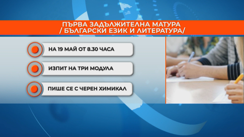 Първата наложителна матура по български език и литература ще бъде на 19 май. Изпитът стартира от 8.30 часа. Разделен е на три модула, с цел да няма преписване. Учениците би трябвало да пишат с черен химикал.