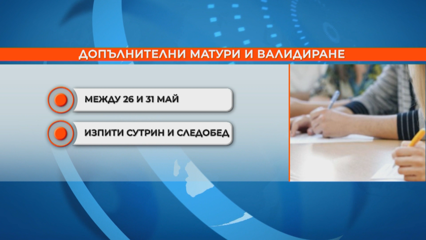 Има и две спомагателни матури по избор, които ще се проведат сред 26 и 31 май като има изпити и заран, и следобед. По същото време ще бъдат и новите изпити за валидиране на компетентности. Валидирането е допустимо по предмет, който не е изучаван във формалното обучение.