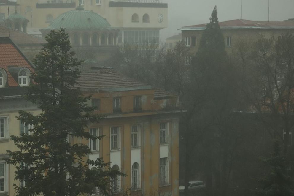 Част от изолацията на жилищен блок пада в прилежащия двор , а вятърът прекършва 80-годишни дървета в центъра на града.