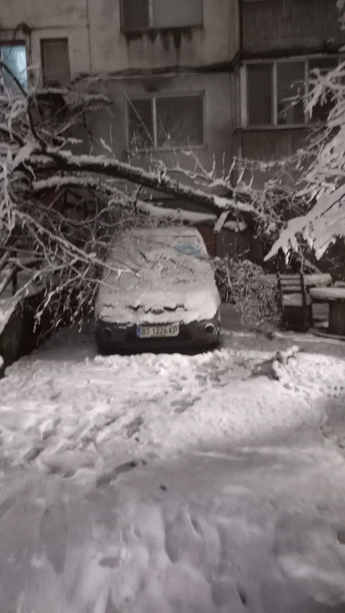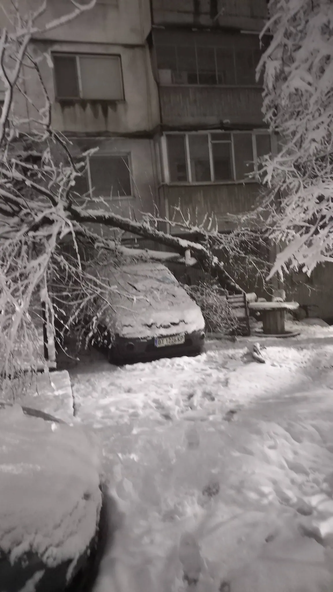 Плевенчани разгласиха във Фейсбук фотоси, които приказват повече от всевъзможни публични доклади. Огромно дърво се е стоварило върху паркиран автомобил в жилищен квартал. Клоните са пречупени от тежкия сняг, стволът – рухнал, а колата – затисната под ледената маса.