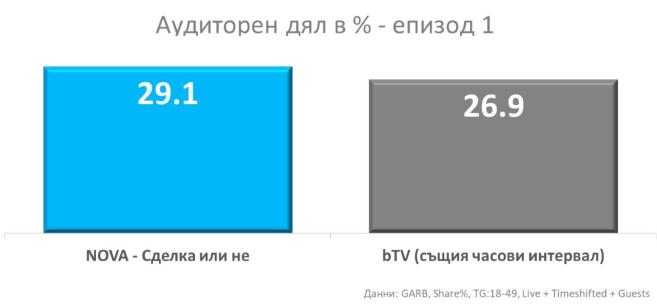 Според формалните пийпълметрични данни, премиерата на „ Сделка или не “ е записала аудиторен дял от 29,1% измежду феновете в дейна възраст (18-49 г.), до момента в който втората телевизия в класацията събира 26,9% по същото време.