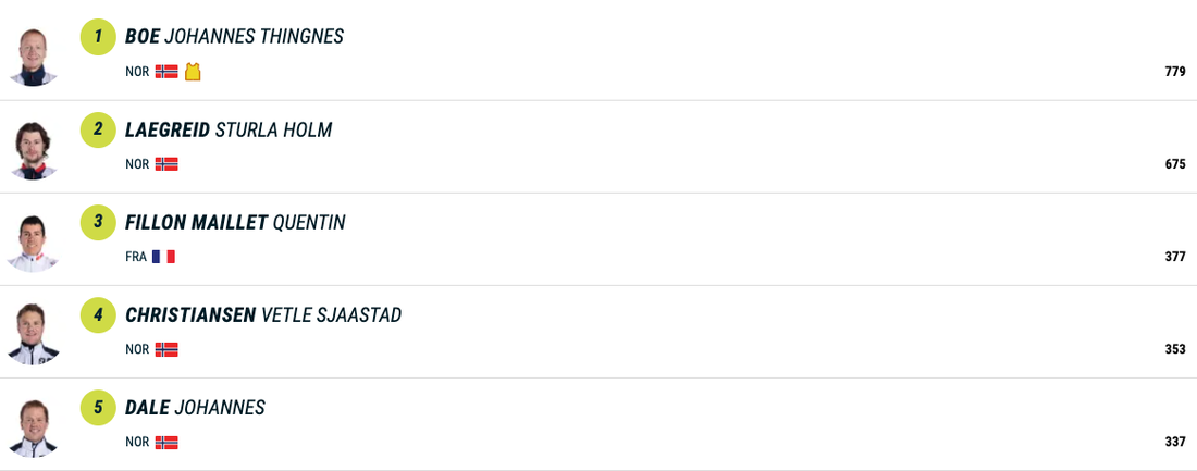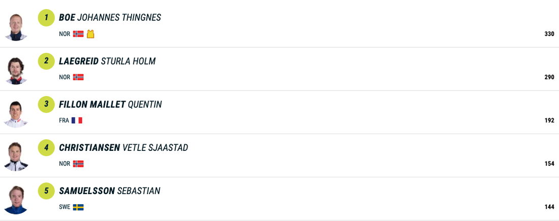 След 10 от 21 самостоятелни старта през сезона Йоханес Бьо е отпред в генералното класиране за Световната купа с общо 779 точки и преднина от 104 пункта по отношение на Легрейд. Тройката затваря Фийон Майе, който с днешния си подиум се изкачи с три места в подреждането. Французинът изостава с 402 точки от първия.