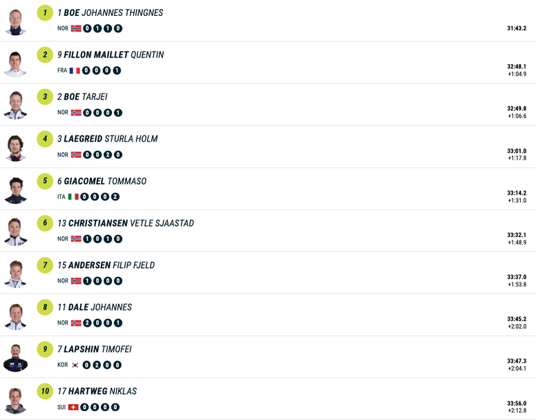 Трети приключи Тарей Бьо, до момента в който на четвъртото място финишира Легрейд, който за едвам повторно през сезона не се качва на почетната стълбичка. Джакомел приключи надпреварата на петото място, като за него това е най-хубаво класиране в кариерата. До момента неговото върхово достижение бе шесто място, което той реализира на два пъти през този сезон, един път в преследването в Хохфилцен (Австрия) и още един път във вчерашния спринт в Поклюка.