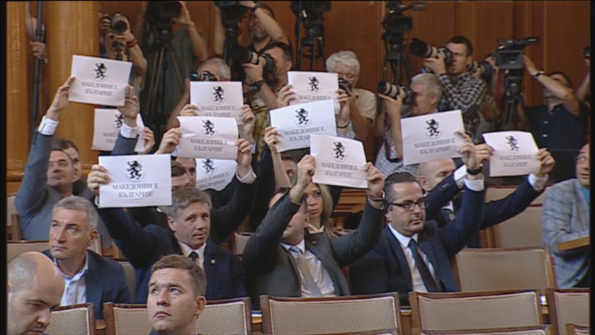 " Вчера чухме от Генчовска по какъв начин нашият министър-председател се е договорил с Вархей. " - сподели Ангел Георгиев от ПГ на " Възраждане ", а негови съпартийци и посетители на балкона на пленарната зала подвигнаха плакати с надпис:,,Македония е България”.