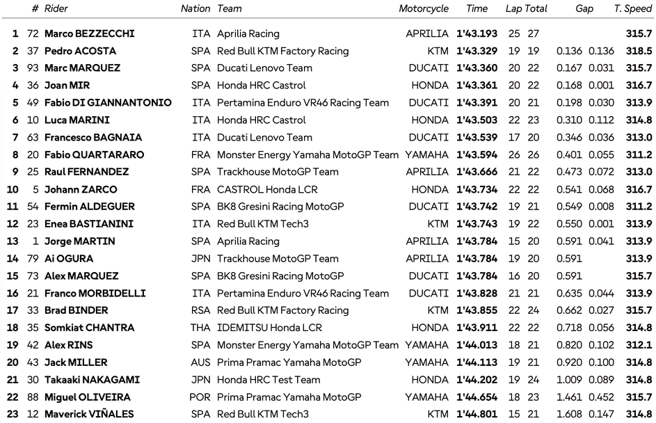 В много обърканите втори 60 минути за подготовка водачът на Априлия зае първата позиция с обиколка за 1:43.193, която той завъртя по време на основните квалификационни симулации в края на сесията, когато времената се подобряваха като на изсъхваща писта, макар че през днешния ден не беше валяло въобще на „ Мотеги “. По този метод той изпревари с 0.136 секунди Педро Акоста, а тройката с пасив от 0.167 добави водачът в генералното класиране Марк Маркес, който още в неделя ще може да си подсигурява международната купа за 2025 година.