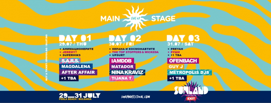 След година спиране, EXIT се завърна в Сърбия с 20 подиуми и 200 000 гости за 4 дни, а в този момент паметният фестивал идва и у нас за първи път. Сръбският екип е към този момент на плаж Перла, където сред 29 и 31 юли ще се състои тридневното фестивално прекарване SUNLAND с над 50 часа музика. Към Nina Kraviz, OFENBACH и S.A.R.S. се причисляват нова вълна от български и задгранични актьори на SUNLAND Mainstage, измежду които английската рап дива IAMDDB, Matador – DJ-ят от Дъблин, прочут със своя революционен метод към електронната музика, звездата на сръбската техно сцена – Tijana T, босненското дуо After Affair, израелският хаус продуцент GUY J и DJ-ите от METROPOLIS. Те ще разделят сцената с Ъпсурт, Руши, Анимационерите, Керана и космонавтите, Jeremy?, The top stoppersWICKEDA, Preyah и Superhiks, а последните попълнения към фестивалната стратегия се чакат напълно скоро.