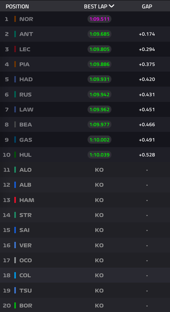 От седмото място ще потегли Лиам Лоусън, а Оливър Беарман, който беше доста бърз в хода на цялата квалификацията до решителните обиколки остана едвам осми. Първата половина на стартовата решетка ще добавят Пиер Гасли и Нико Хюлкенберг.